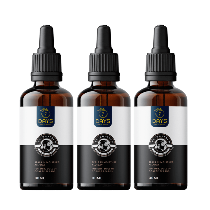 7 DAYS Beard serum products are a blend of various ingredients, such as jojoba oil, argon oil, coconut oil, grape seed oil, hempseed oil that are used to address specific beard problems such as itching, sensitive skin or dryness by going straight to the follicle in a similar fashion to hair conditioner. Beard oil acts as a moisturizer that goes straight to the hair follicle and restricts hair from growing brittle, especially in cold, windy environments as these weather conditions cause the natural moisture of the beard area to wick. Hydration around this area helps prevent flaking, dandruff and skin dryness. Some brands of beard oil may contain added vitamins or nutrients such as vitamin E. This moisturization prevents general itchiness and irritation of the skin under the beard.